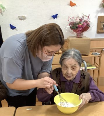粉をボールに入れる→卵を割る→牛乳を入れる→あわ泡立器で混ぜる→ふわふわのホットケーキができました!「みんなで作るホットケーキは柔らかくて美味しいね…」と大好評でした。