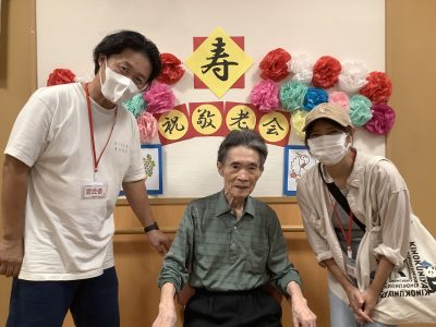 お祝い膳に「すごいね」「美味しそう」と美味しく召し上がってもらえました。食事の後、お花の前で記念写真、皆さんとても素敵な笑顔でした。