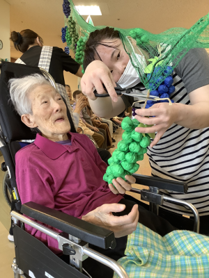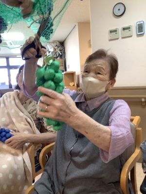 ご利用者の皆さんで作成したぶどうをフロアに飾っていましたが『そろそろだね』と収穫祭を行いました。たくさんのぶどうを収穫して季節を感じることができました!!