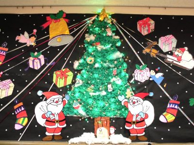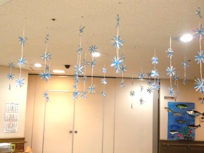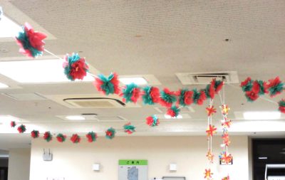 (フロアの飾りも12月からクリスマスカラーとなっています。壁絵はご利用者の皆様が協力され作成したツリーです!素敵ですよね)