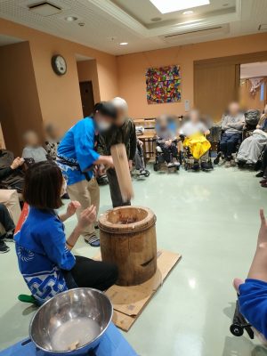 多くの利用者様、入居者様が職員と一緒にデイサービスセンター、ケアハウス、特養従来、特養ユニット、グループホーム、デイサービスセンター第二 と 職員と杵・臼とともに「もちつき巡業」を行いました