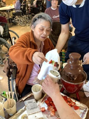 2月バレンタインに合わせてレクリエーションを開催しました。各階でチョコレートフォンデュを楽しんだり、パネル記念撮影やお寿司の出前を召し上がられたり素敵な一日となりました。